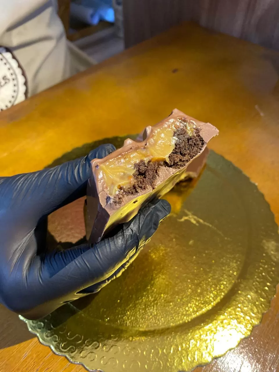 Barra de chocolate belga recheado com Brownie e Caramelo Salgado.