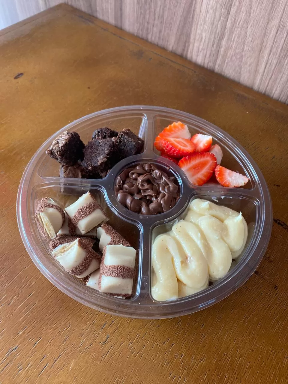 Nutella, Briagadeiro de Leite ninho, Morangos, Kinder Bueno e o Delicioso Brownie Jujuba.