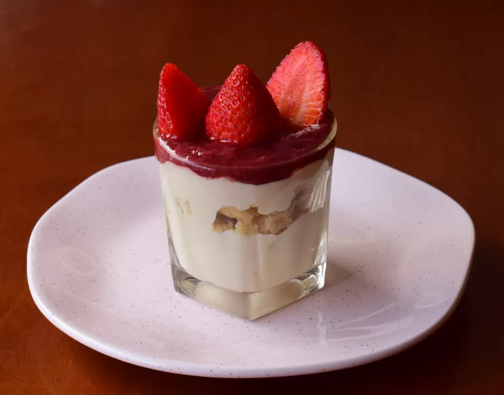 Brownie branco Jujuba, creme de baunilha e geléia de frutas vermelhas.