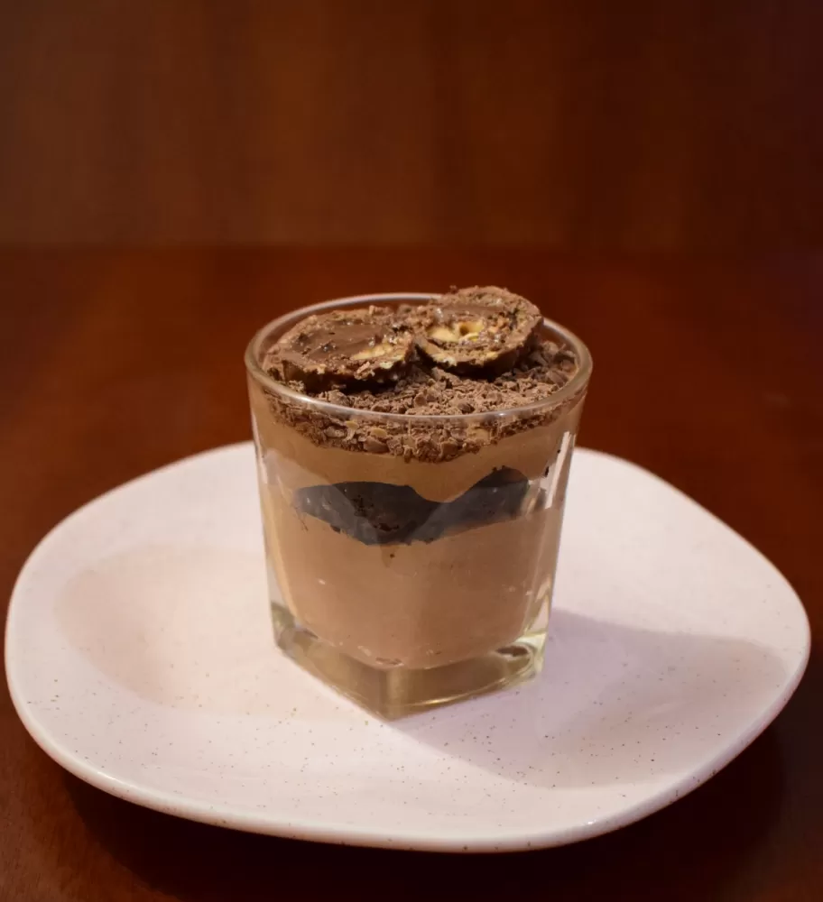 Brownie preto tradicional, ,ousse de chocolate belga e Ferrero Rocher.